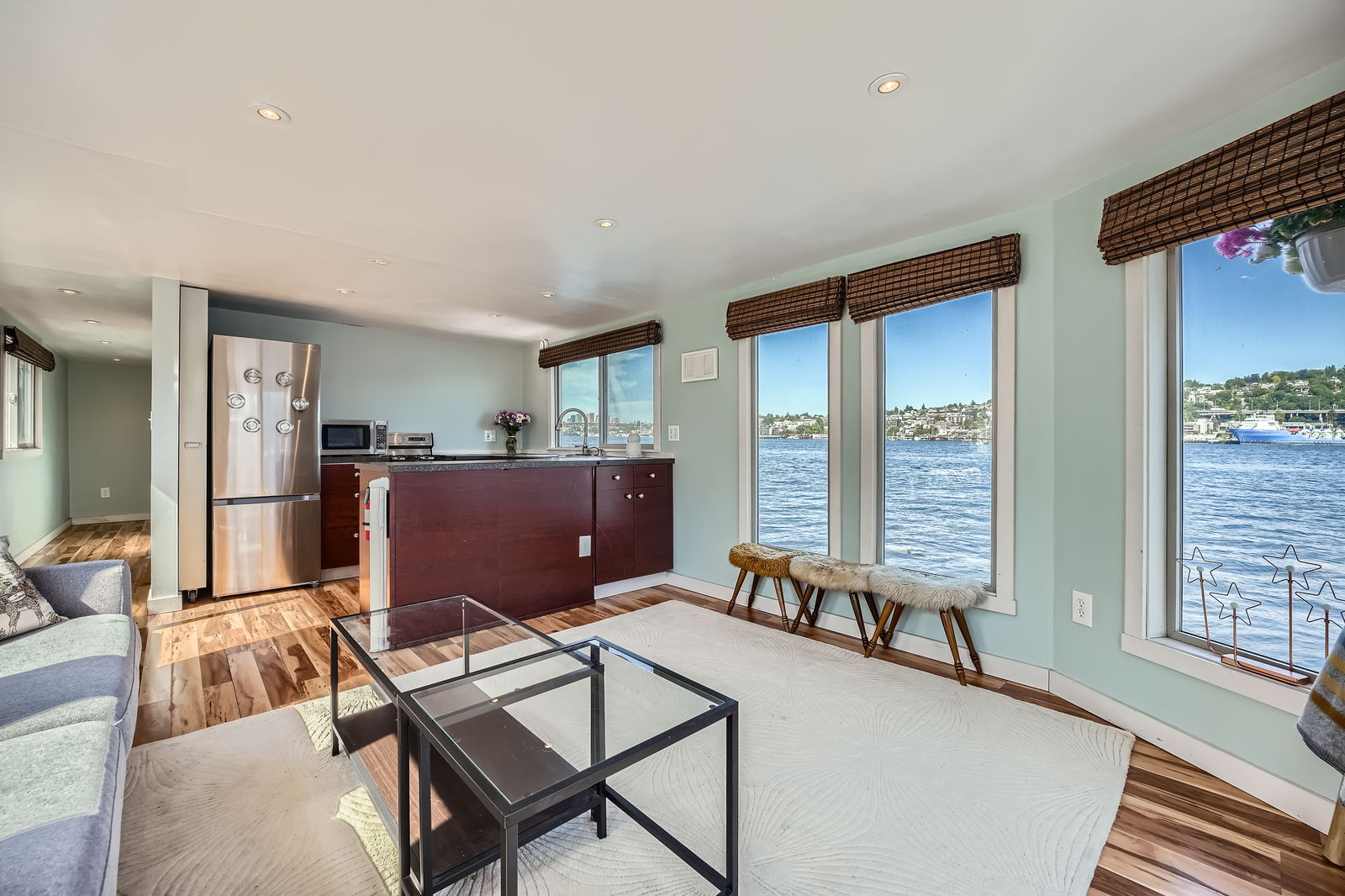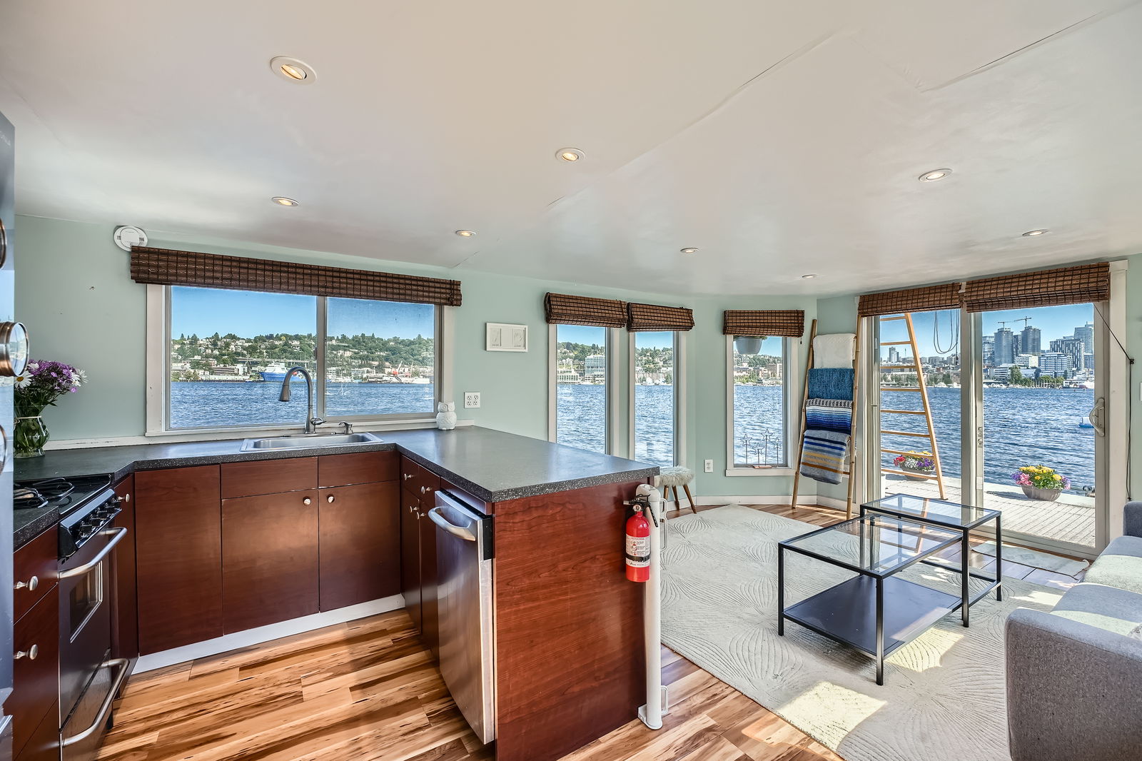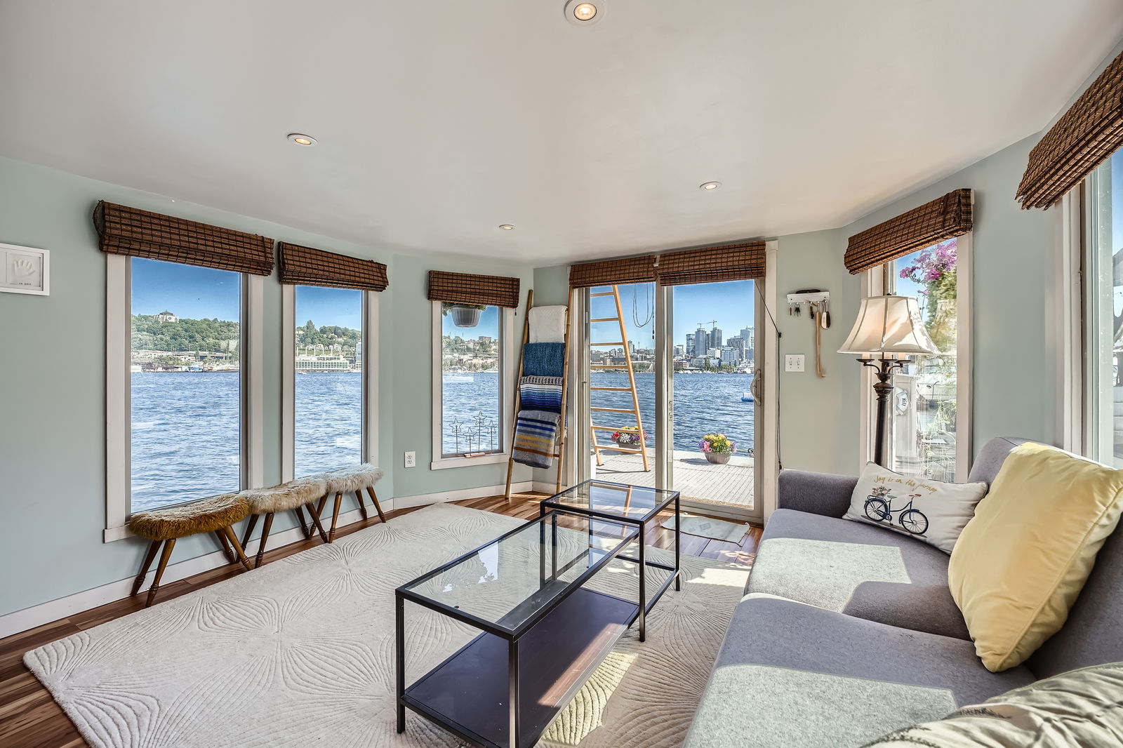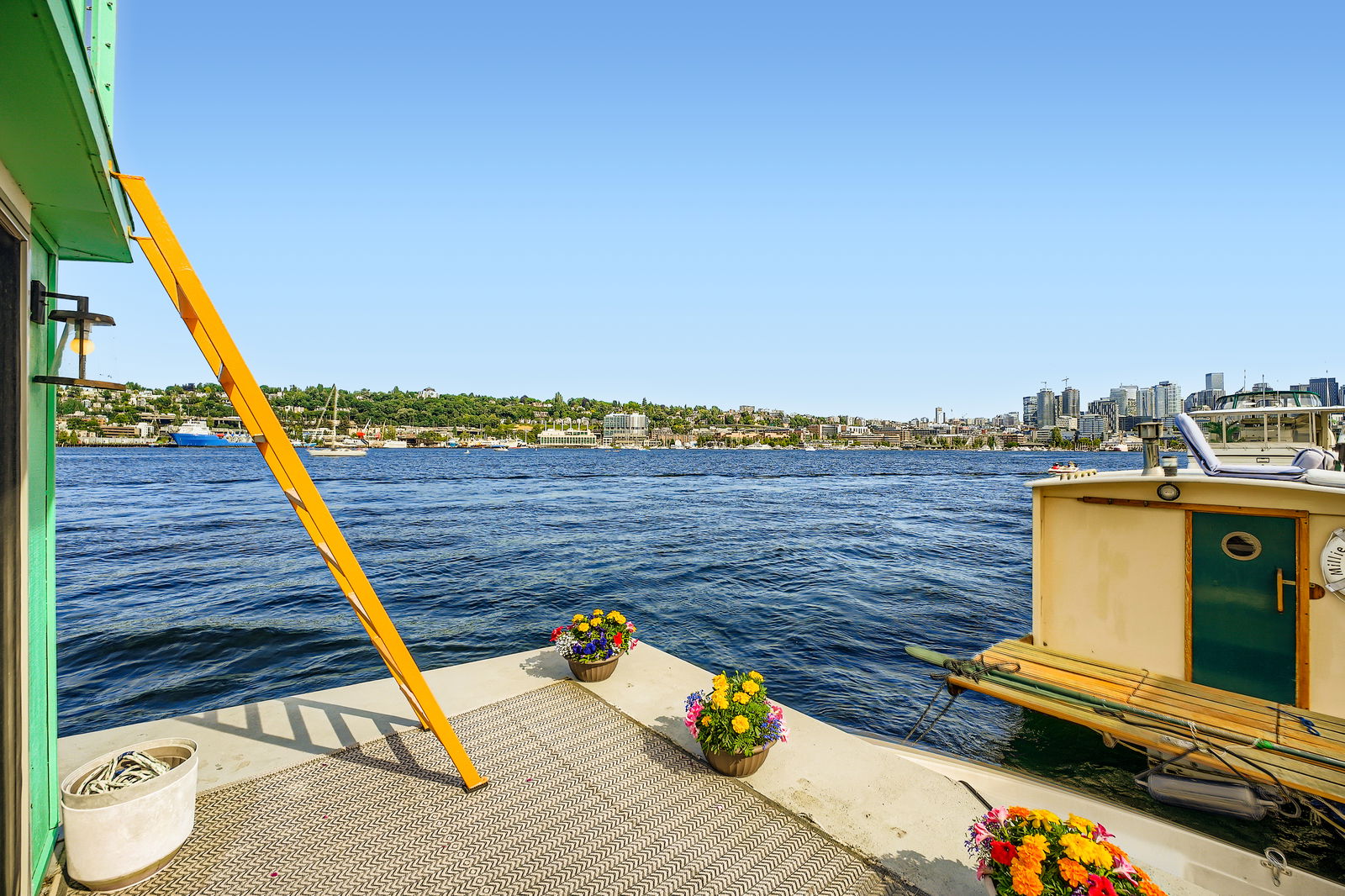 Live the ultimate Seattle houseboat lifestyle aboard Ginger, a striking aqua-hued floating home located at the coveted end of the dock, offering unobstructed, panoramic views across Lake Union. From sunrise reflections to the sparkle of city lights, your rooftop deck becomes a front-row seat to it all.