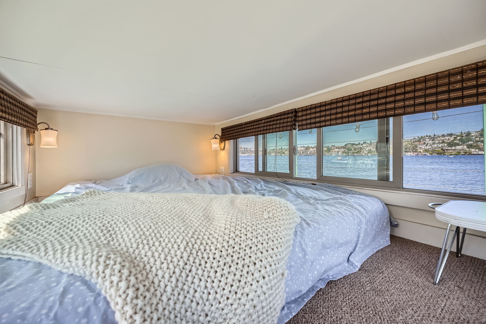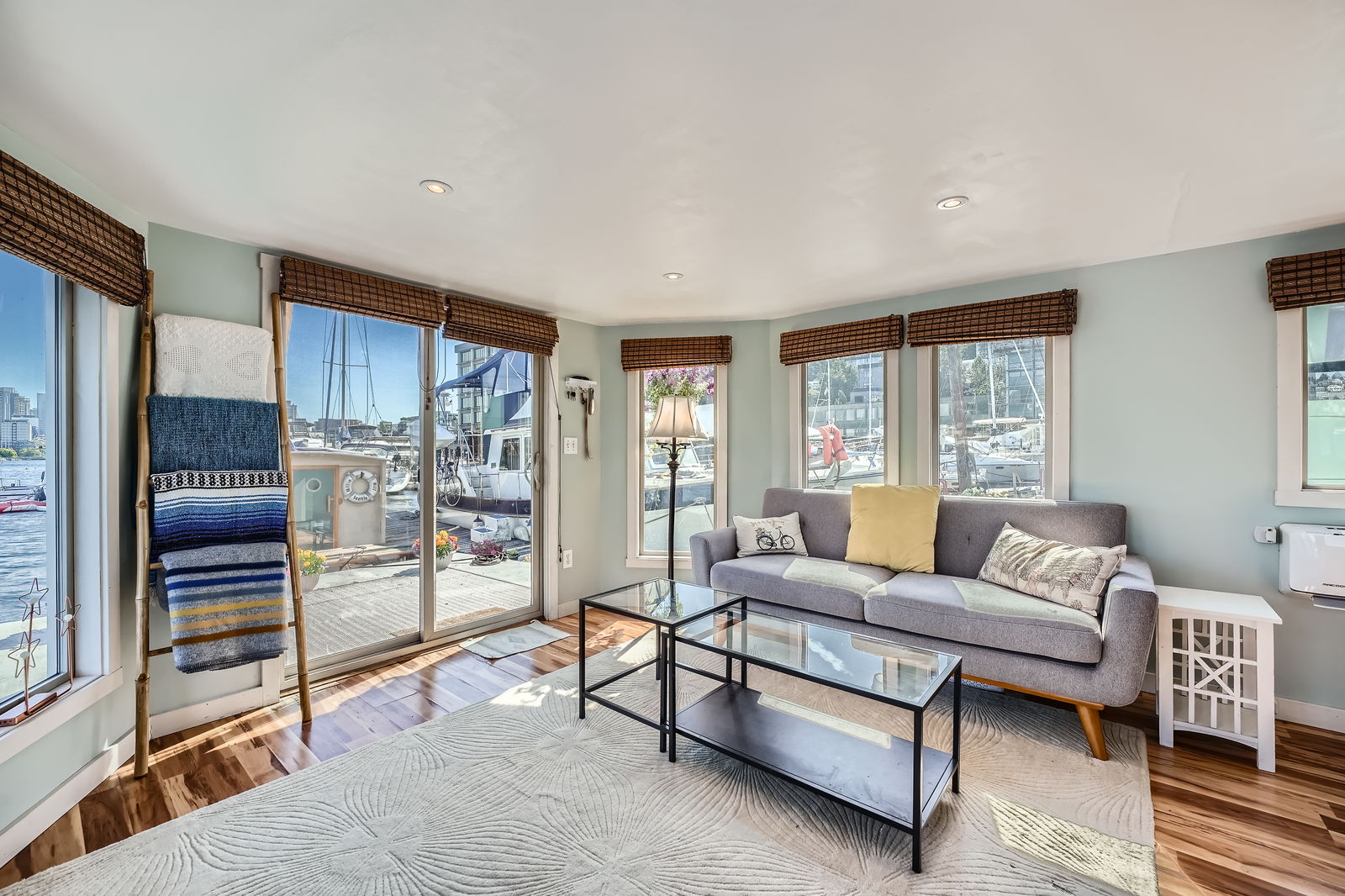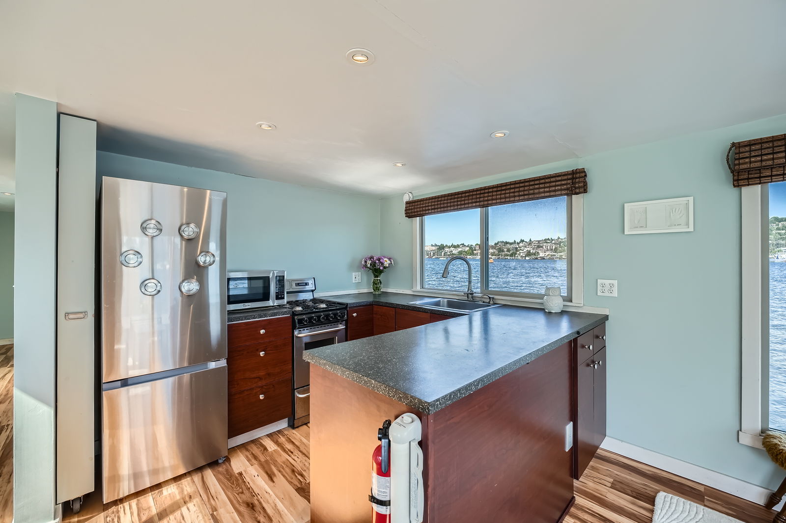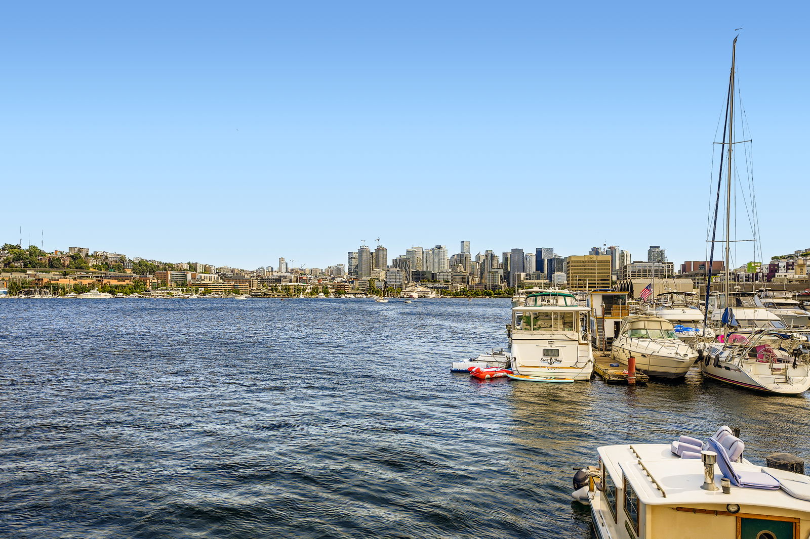 Live the ultimate Seattle houseboat lifestyle aboard Ginger, a striking aqua-hued floating home located at the coveted end of the dock, offering unobstructed, panoramic views across Lake Union. From sunrise reflections to the sparkle of city lights, your rooftop deck becomes a front-row seat to it all.
