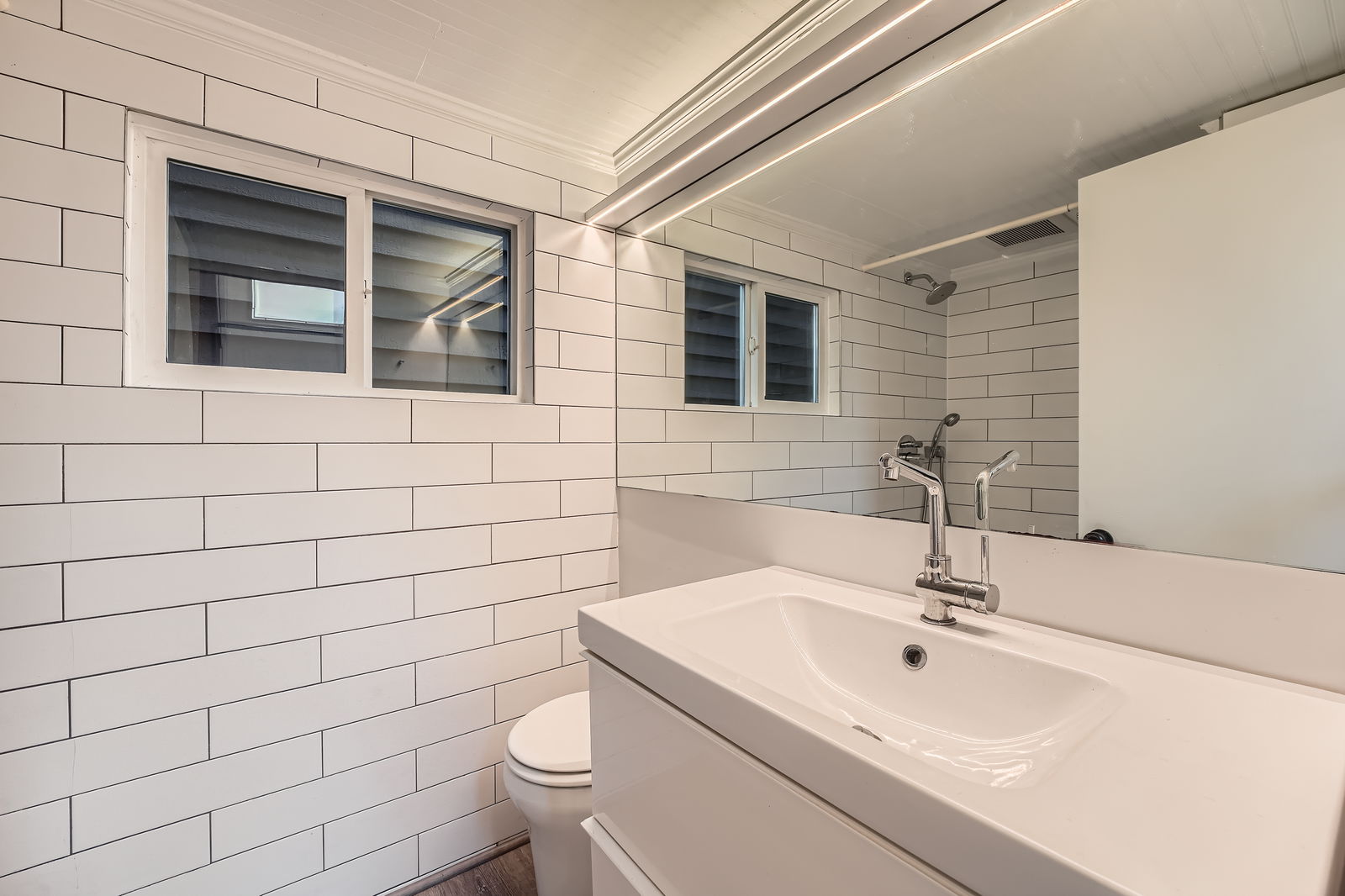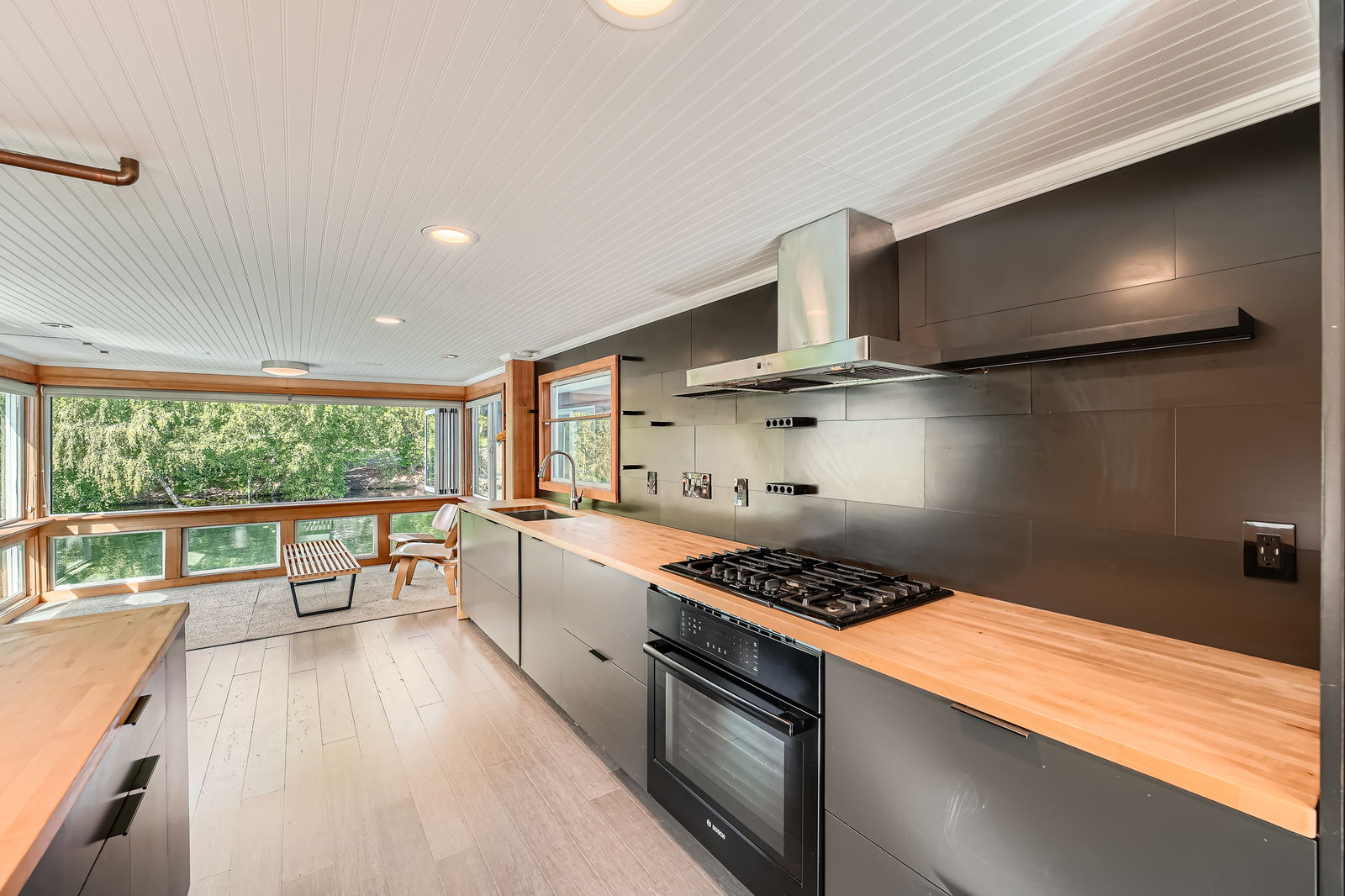 Inside, contemporary updates shine: a sleek kitchen with hidden appliances, a built-in banquette dining area for six, and a sun-filled living space with a fully opening Euro-style window that brings the outdoors in.